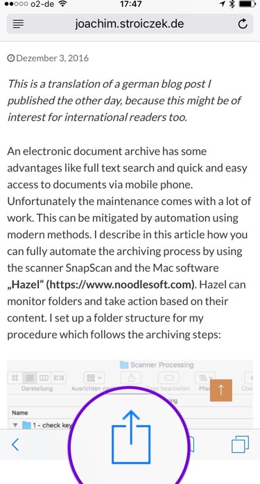 In dem Beispiel soll eine Web-Seite in ein PDF Dokument umgewandelt werden. Zunächst wird das Teilen-Menü aufgerufen: