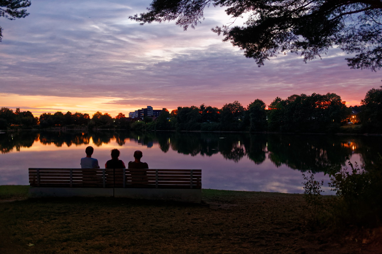 Heute hatten wir einen schönen Sonnenuntergang. Da kommt der neu gestaltete Dedinger-Heide-See sehr schön zur Geltung. Die Bank auf der Wiese ist perfekt positioniert…